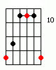 patterns derived from the open CAGED positions, root notes are in red.